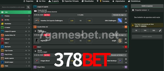 O 378Bet oferece uma grande seleção de opções de apostas em e-sports com probabilidades competitivas